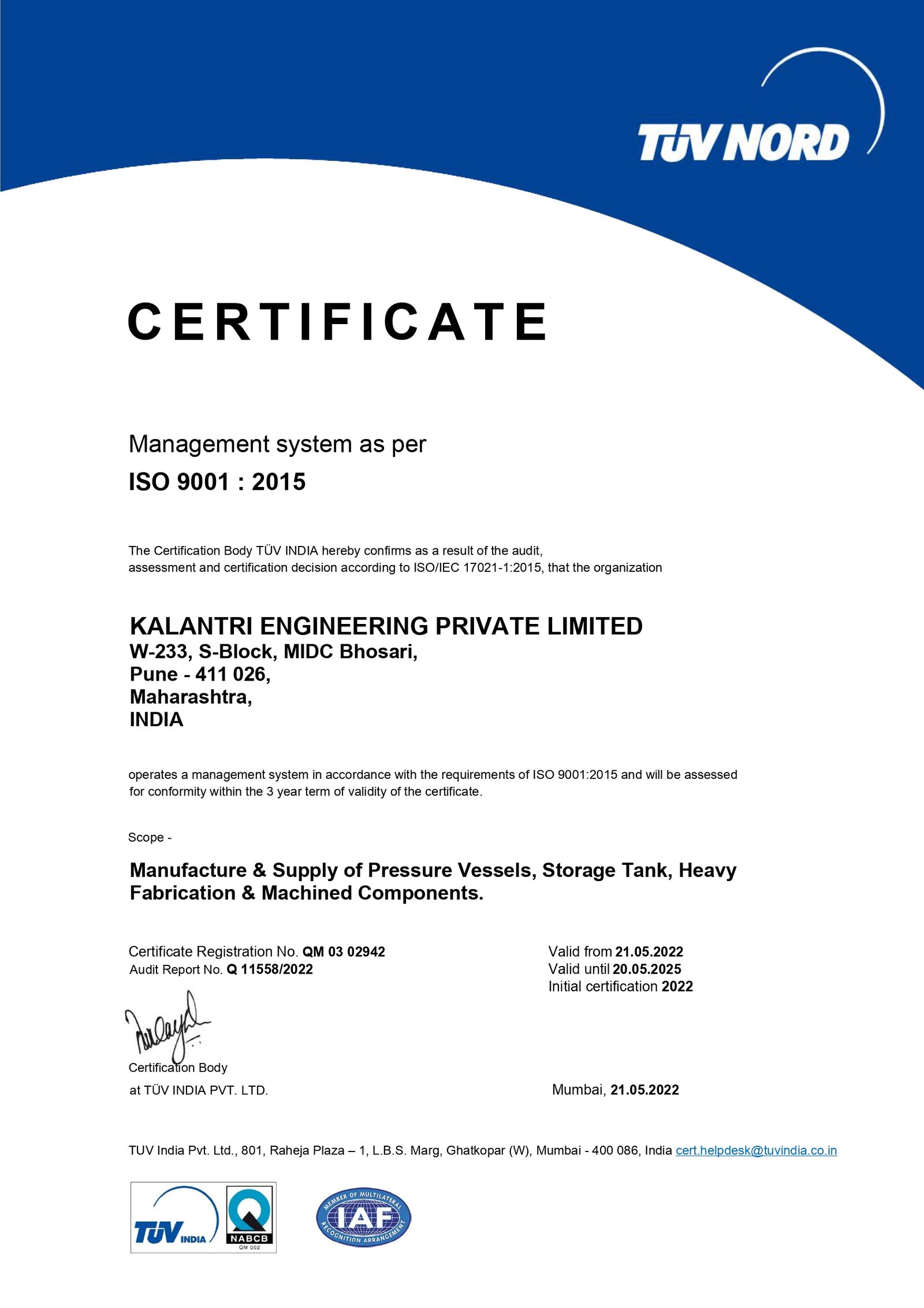 Kalantri Engineering Pvt. Ltd. , Founded in 1997, specializes in high-quality fabrication and process equipment. With ISO 9001:2015 certification, we deliver precision-engineered products, including heat exchangers, pressure vessels, storage tanks, and custom solutions, all adhering to international standards like ASME. Our manufacturing facilities are strategically located in MIDC Ambad (Nashik) and MIDC Bhosari (Pune), both equipped with cutting-edge technology to ensure the highest standards of engineering excellence.